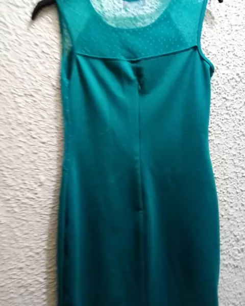 Vestido corto sin manga. Vestido corto color verde con malla en hombros y los costados trae cierre en la parte de atrás, tela 93% poniente 3% elástico.