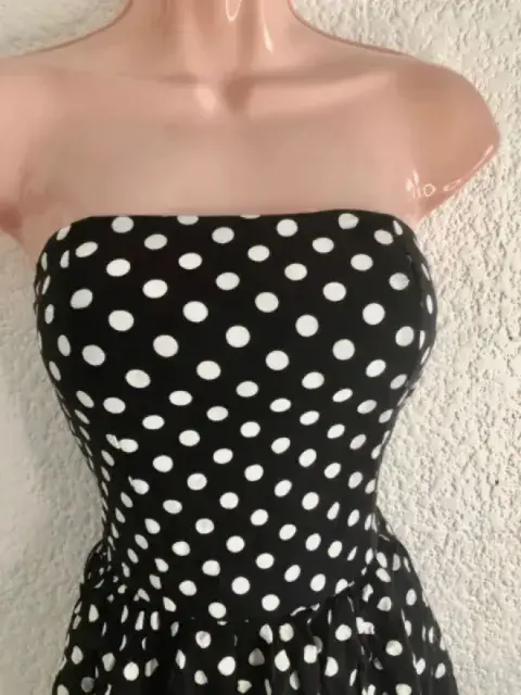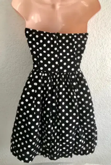 Vestido corto de strapless negro conPuntos blancos tiene crinolina es talla S, súper fresco e ideal para la temporada de primavera verano. Tiene unas manchitas casi imperceptibles por el tipo de patrón, están en las fotos.