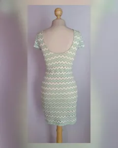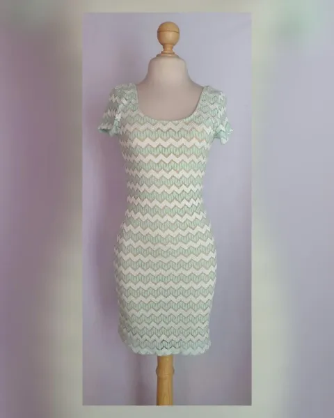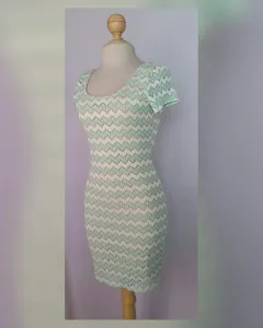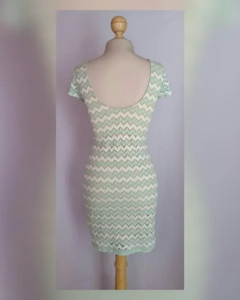 Vestido stretch corto bitono BLANCO/VERDE PISTACHE c/aplique hilo metalizado tono DORADO, cuello redondo, manga casquillo, sin sistema de cierre y forro interior. Talla L (REDUCIDA, da a S/M). Dimensiones cms: 34 hombro, 42 axila, 35.5 cintura, 45 ruedo, 74 largo, 13.5 largo manga. 50% poliéster, 40% nylon, 6% fibra metalizada, 4% spandex. P/lavado en casa.***POR LA COMPOSICIÓN DE LA PRENDA, DA DE SI APROX 10 CMS***NUEVO, NUNCA SE USO, LE QUITE LA ETIQUETA PARA USARLO Y NO ME QUEDÓ.***SIN DETALLES***