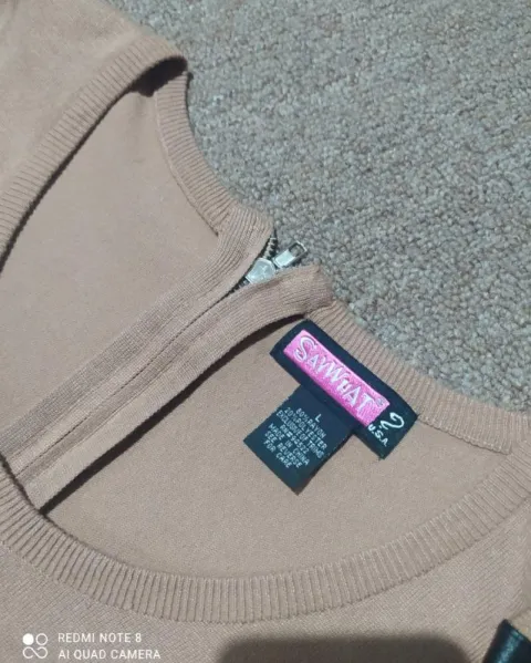 Vestido tipo suéter color camel. Aplicaciones de vinipiel en brazos, talla L. Cierre superior en parte trasera. Nuevo sin etiquetas ✨