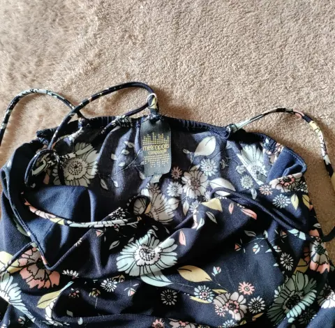 Vestido corto, tirantes. Vestido corto de tirantes, estampado floral con base azul marino, hermoso detalle de tirante en el cuello