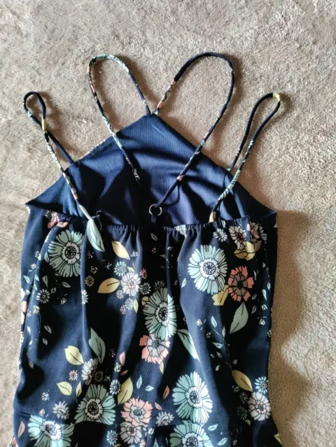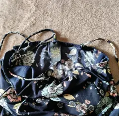 Vestido corto de tirantes, estampado floral con base azul marino, hermoso detalle de tirante en el cuello