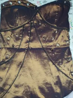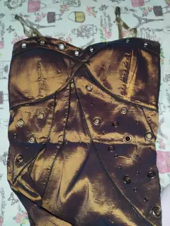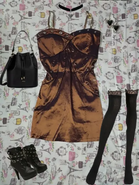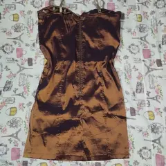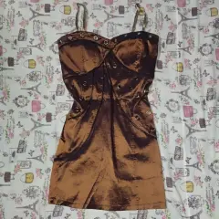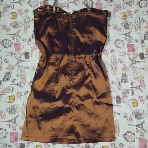 Sexy vestido corto y señido color cobre con detalles de estoperoles y zippers metálicos en la parte de enfrente del busto, copas integradas, se siñe perfecto a tu figura, la tela es strech tornasol, tiene zipper en la parte de atrás, tirantes delgados y escote de corazón, en perfectas condiciones