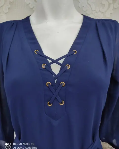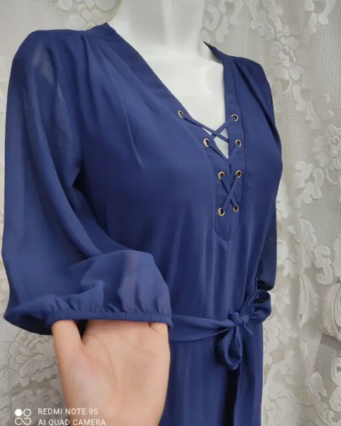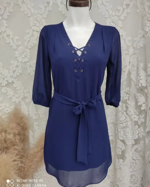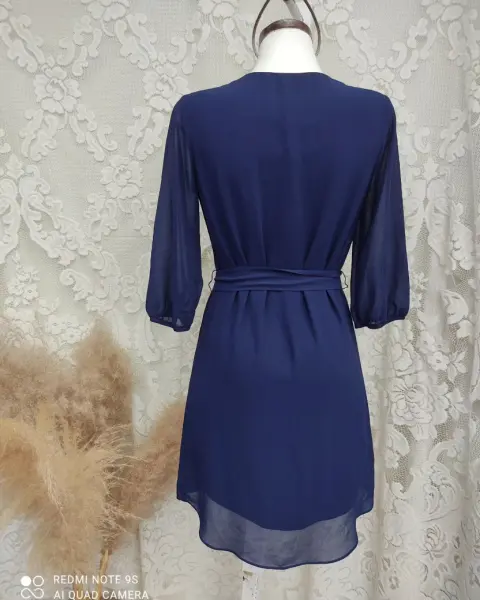 Vestido de tela vaporosa con forro completo manga 3/4, escote con cintas cruzadas color azul marinoTalla XS/SMedidasAxila a axila 43cmHombro a hombro 36cmCintura 72cmLargo 86cm