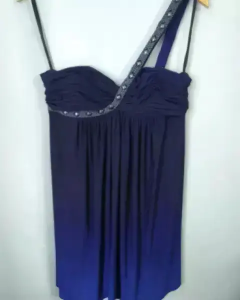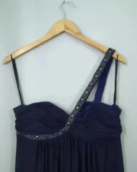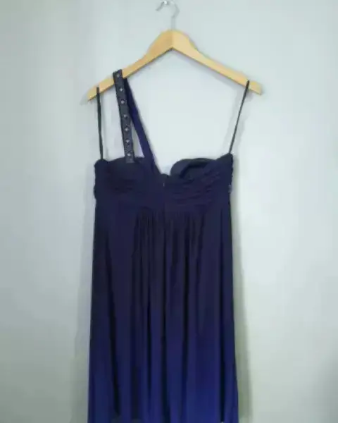 Vestido cruzado. Vestido en perfectas condiciones color azul marino degradado en la parte de abajo. Hermoso detalle en el tirante.Es largo llega a la altura de las rodillas tiene fondo y cierre oculto, además esta corrugado en la parte del busto y como se observa en la fotografía es suelto.Medidas aproximadas:Pecho 81 cmLargo desde los hombros 95 cm