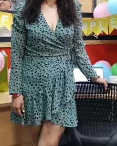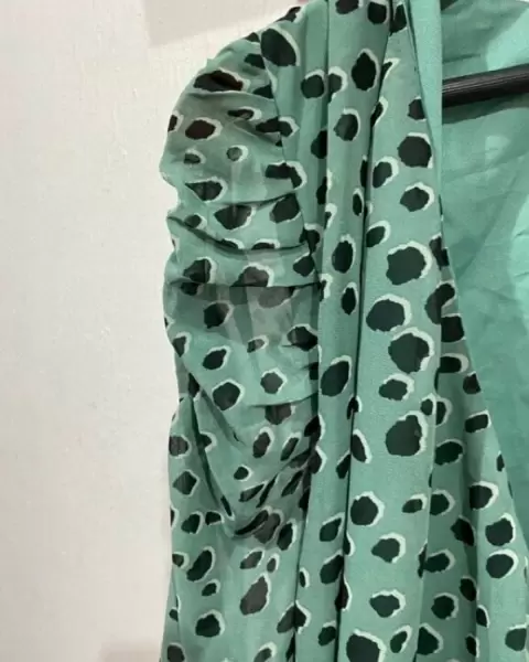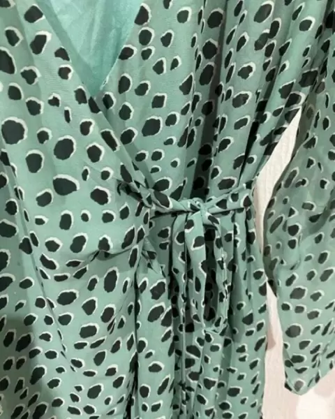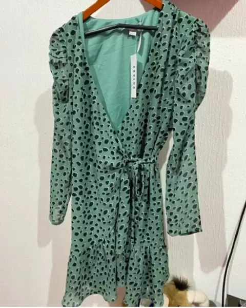 Vestido con print verde, cruzado con amarre en cintura, tiene forro y esta nuevo. Es más opaco, pero la cámara no agarra el color exacto. Esta super lindo pero yo soy muy alta y me queda algo corto