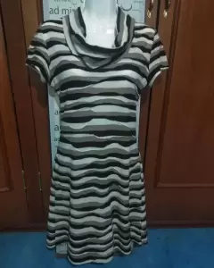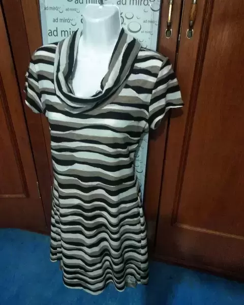 Vestido cuello volcado. Hermoso vestido color beige y café manga corta, cuello volcado. Elaborado en algodón. Medidas: 49cm de axila a axila. 42cm de cintura. 88cm de largo.