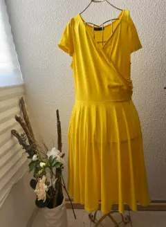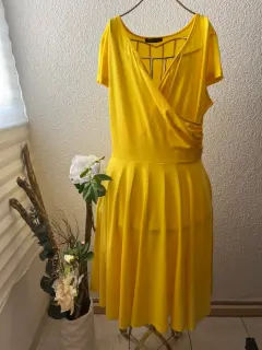 Vestido curvy Amarillo T. EX Angelady. ¡ La que de amarillo se viste en su belleza confía!Vestido amarillo talla XL Marca Angelady línea A con vuelo, escote cruzado y manga corta.Medidas : largo 1 metro, de hombro a axila; 24 cm,de axila axila; 45 cm