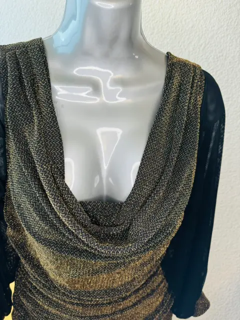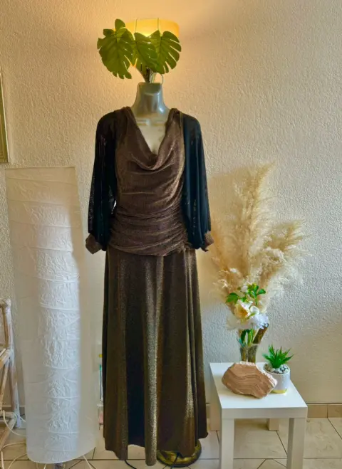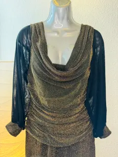 Vestido elegante de noche NightWey talla 14 color bronce, de manga larga de doble gasa y puños de la misma tela que el vestido y torso drapeado.Ideal para ese ésta época de fiestas decembrinas 🎄 o un evento que requiera código de vestimenta elegante.