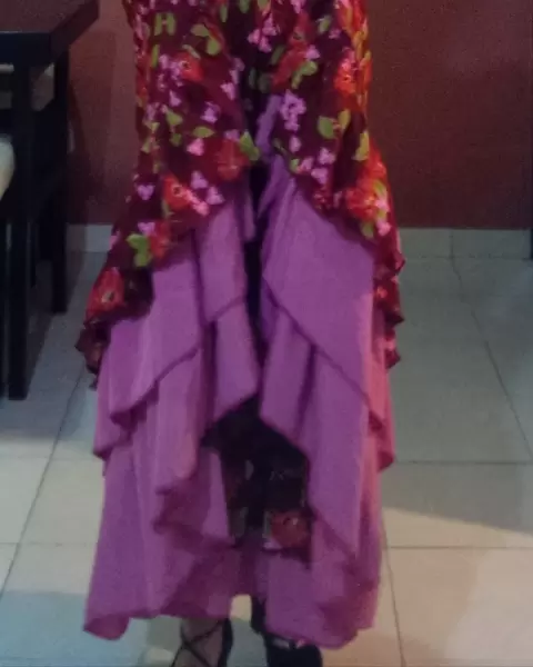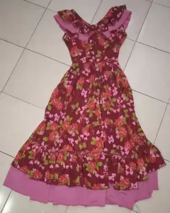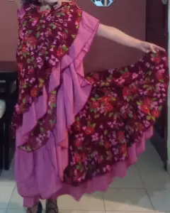 Vestido de estampado floreado con cuello V, sin mangas, olanes bicolor en la parte baja, cuello y lateral, con cierre en la parte posterior, con caida súper bonita y muy comodo para bailar, ✨detalle: descosido del cierre pero muy poquito (ver última foto) Talla 7