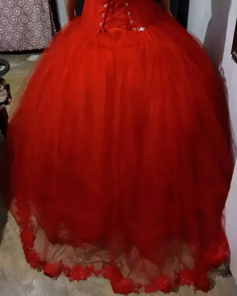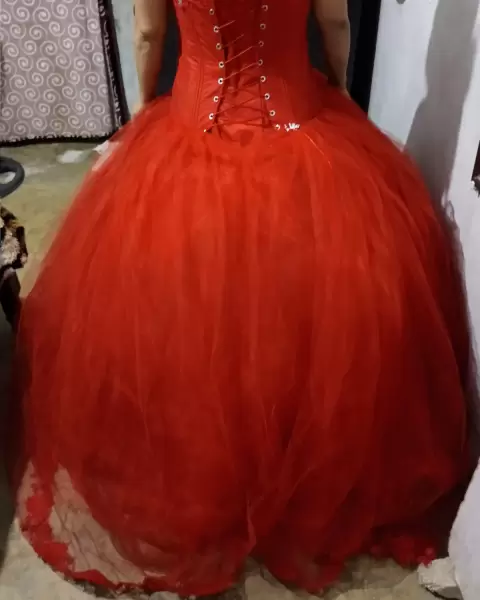 Vestido de 15 años. El vestido se está vendiendo urgentemente en ocho mil pesos, el color es rojo y no está en mal estado, es talla grande pero de la cintura es ajustable, y trae la crinolina incluída