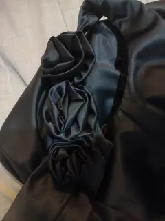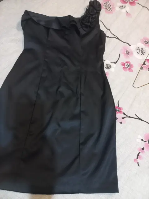 Vestido negro de cocktail con hombro descubierto y aplicación de rosas en la misma tela.