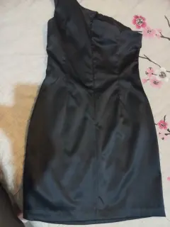 Vestido de cocktail. Vestido negro de cocktail con hombro descubierto y aplicación de rosas en la misma tela.