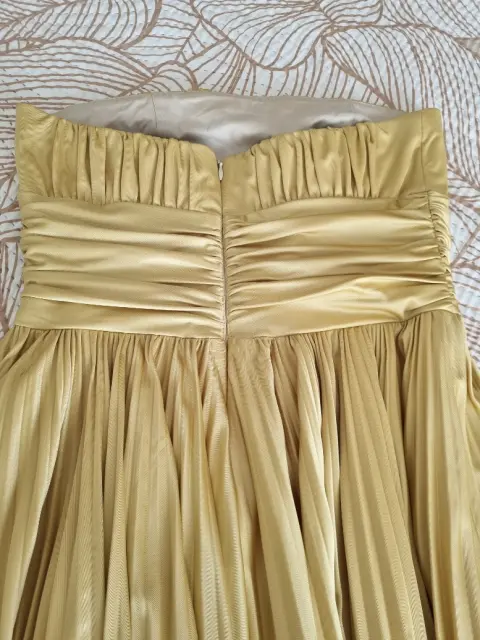 Lindo vestido de Cocktail color dorado, straple corto, talla Mediana con forro plisado