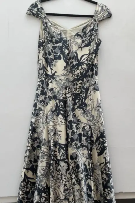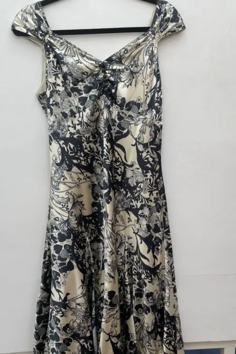Vestido de coctel, talla 10, marca Julio, excelentes condiciones, color beige con azul marino, largo a la rodilla.