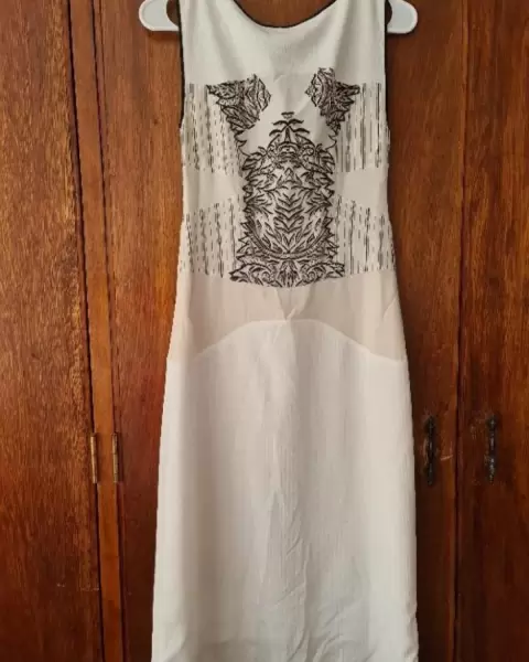 Vestido de cóctel. Vestido a la rodilla, ligero, ideal para primavera. Tiene un fondo beige. Cierre a un costado. Medidas 41 cm de axila a axila. Cintura 35 cm largo 104 cm