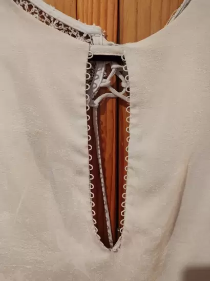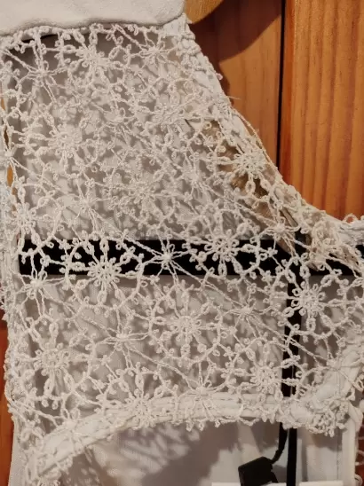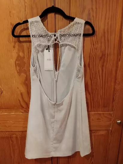 Mini vestido con escote en el pecho y espalda descubierta, detalle de encaje en la parte trasera super lindo mide de axila a axila 44 y de largo 84 la tela es de un gris muy tenue y esta estampada con flores