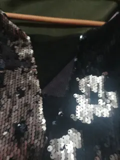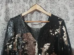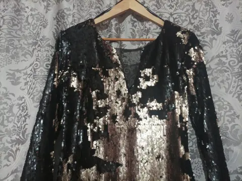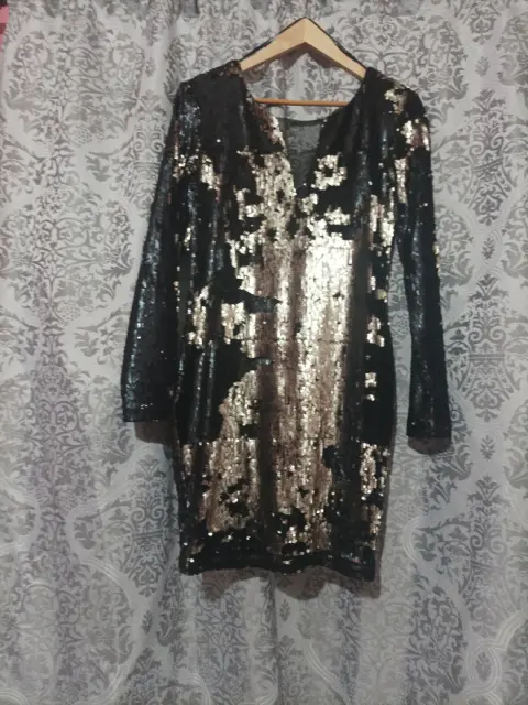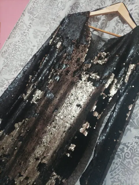 Excelente vestido de lentejuelas color negro con dorado , al moverte cambia de posición la lentejuelas, talla S queda a M porque la tela es expandes , medida de hombro a hombro es 40 cm De axila a axila 44 cmDe largo 83 cm Cuello y espalda en V con tela transparente en la parte del pecho !