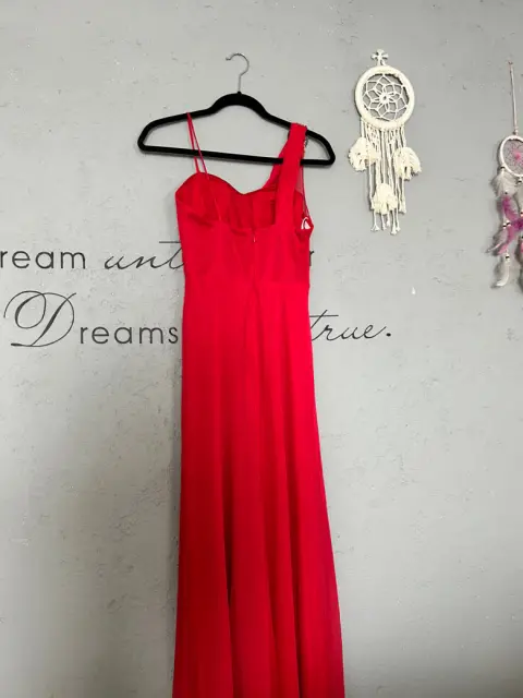 Vestido rojo talla S, corto del frente y largo de atrás; un solo tirante con detalle de pedrería