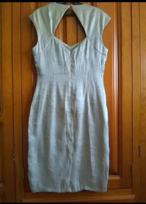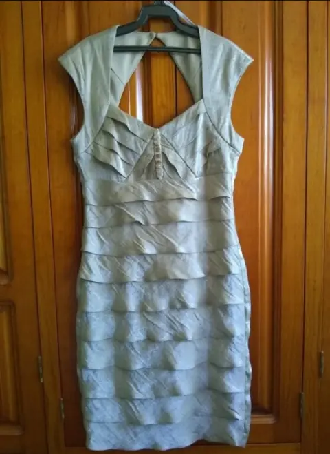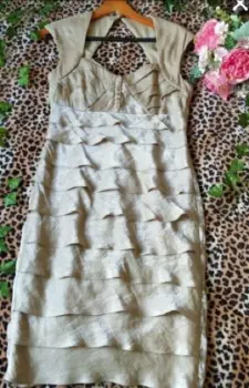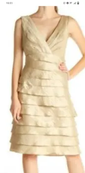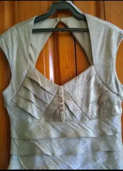 Lindo vestido corto, en la espalda tiene un escote discreto, los olanes al frente son favorecedores . Tiene pedrería como detalle de adorno. Luce similar a la primer foto.Comprado en Liverpool