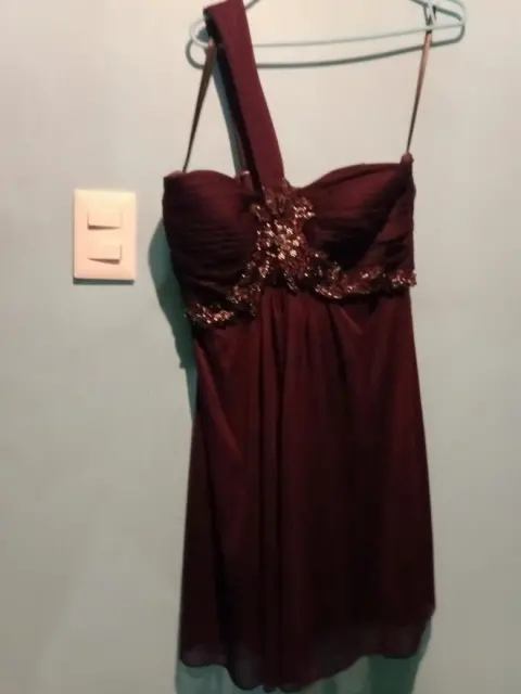 Hermoso vestido corto de coctel color plum talla 10. Tiene un solo tirante y pedrería al frente.