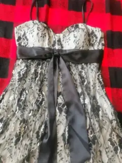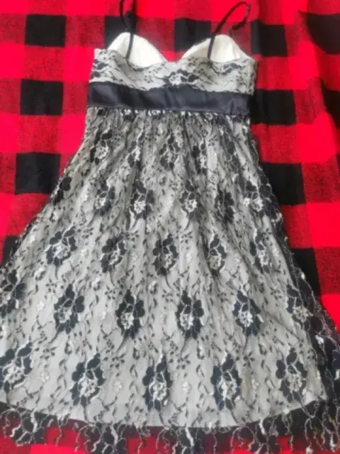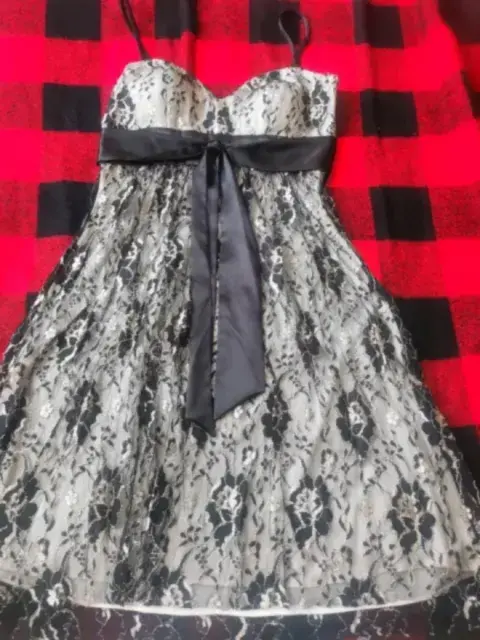 Moderno vestido de cóctel, corte princesa con tirantes y moño de seda negro, tela bordada en color dorado y negro, Talla 8 (mediana)