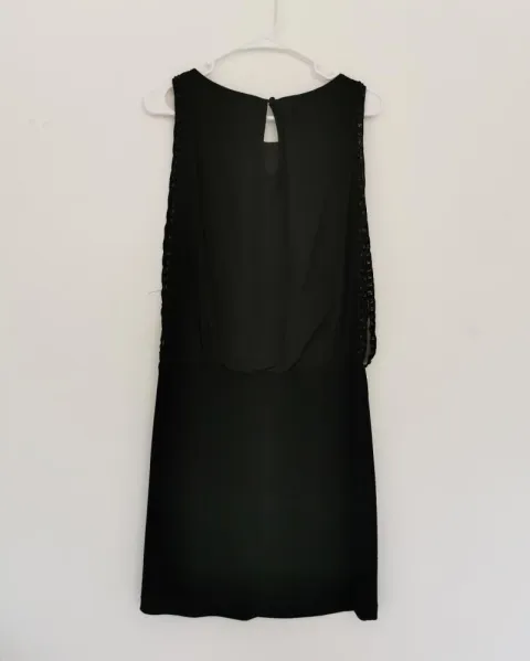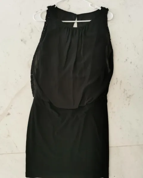 Vestido de coctel negro. Sin mangas. La parte superior es de tela de chifón transparente con bajo vestido. Tiene bordado de pedrería en las orillas de los lados. La falda es de tela tipo stretch. Talla 4.