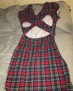 Es un vestido a cuadros pegado al cuerpo, con espalda semi-descubierta, hasta las rodillas, lindo para una salida con amigas o aún fiesta casual