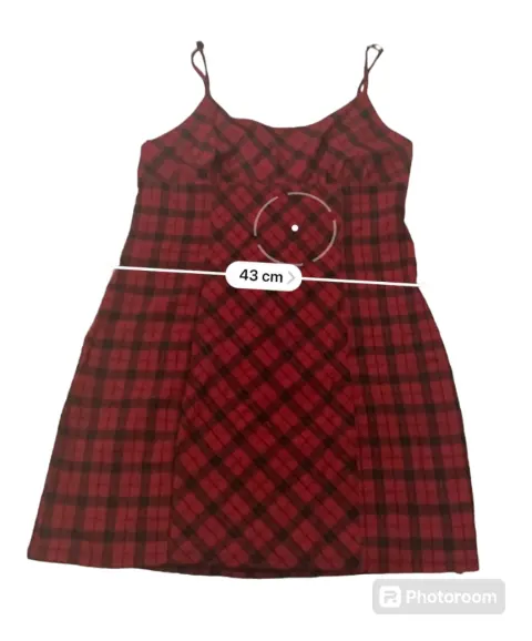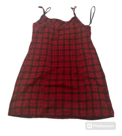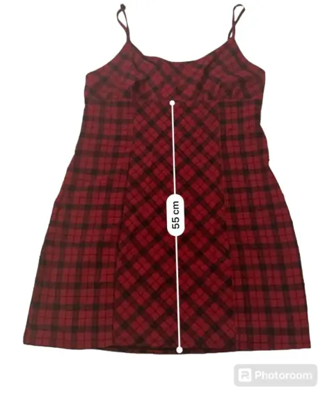 Vestido de cuadros. Vestido corto de cuadros, rojo con negro y una línea gris, tela 73% rayón, 24% poliéster y 3% spandex, estira, no trasparenta.