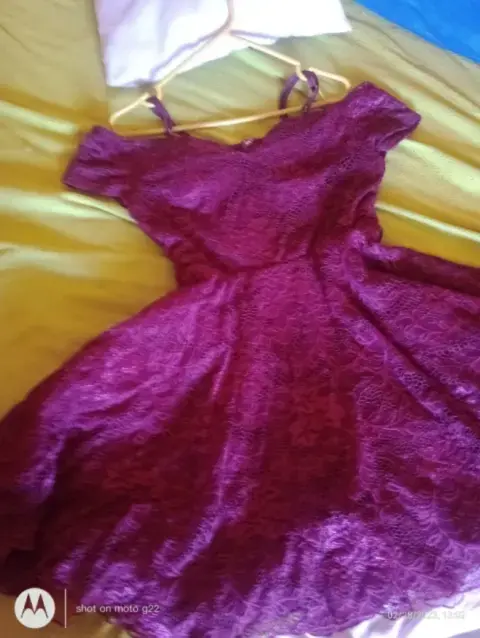 Vestido de dama elegante tipo princesa. Vestido de encaje Sólo se uso una vez.Es color vinoTela suave: 8% eslastano y 92% naylonTrae forro (para q esponje)Vestido corto arriba de las rodillasTrae tirantesVestido juvenil tipo princesaMarca Just BlackQuedaría perfecto con un cinturon para q luzca cintura. ☺️La tela es suave y no estira mucho.Es un vestido de excelente calidad 💎💯 garantizada. Talla grande
