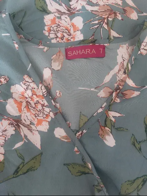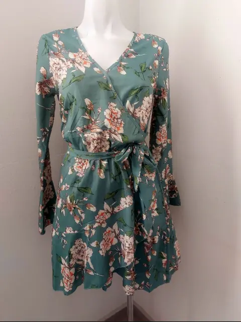 Vestido de dia. Hermoso vestido de frente cris/cross manga larga y con forma circular colores en el estampado beige, café, naranja y verde.