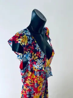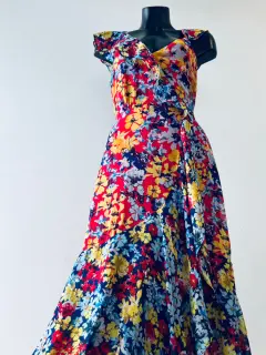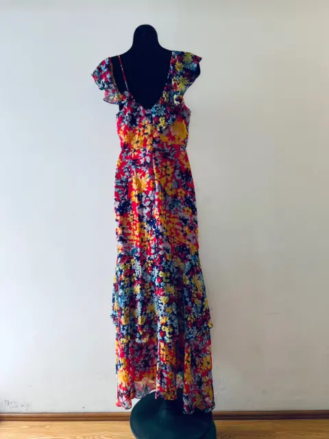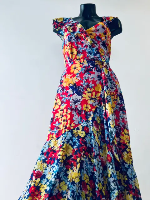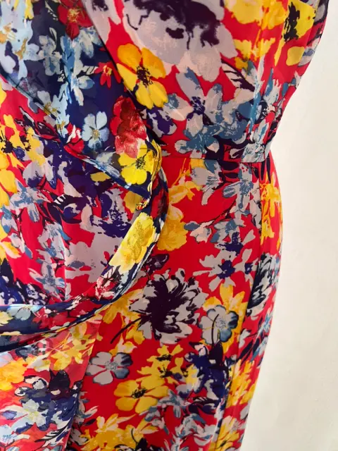 Vestido de diseñador. ¡Exclusivo de Lulús! ¡Deshazte de todos tus problemas con el vestido largo de gasa con estampado floral rojo rubí radiante de Lulus! Gasa roja, con estampado floral amarillo, azul y blanco, construye este hermoso vestido largo asimétrico con escote en V y corpiño con pinzas. Una cintura imperio y un corpiño cruzado de imitación están sostenidos por una correa gruesa sin mangas y hombro descubierto