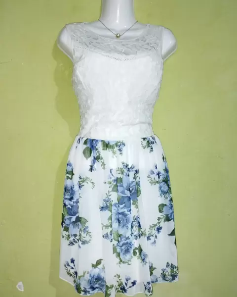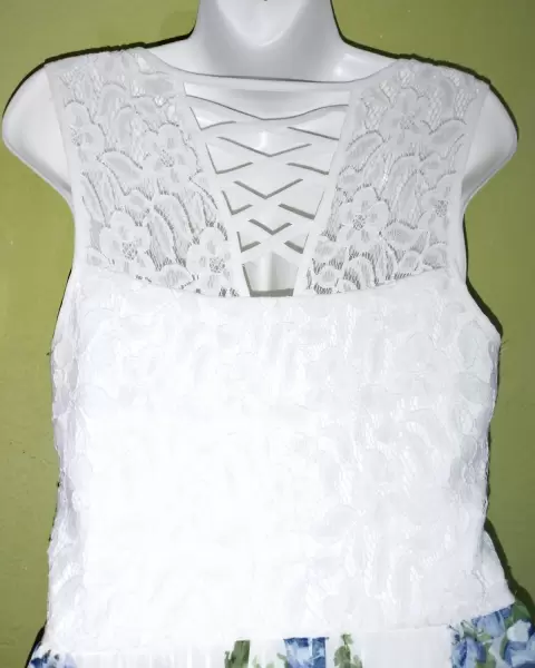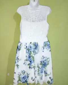 Vestido de Encaje. Lindo vestido corto, la parte de arriba es de encaje y la falda es una tela delgada floreada.Color: Blanco con flores azulesTalla: 7