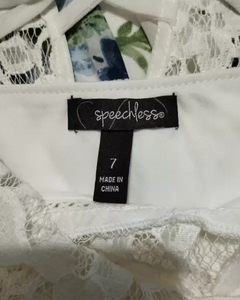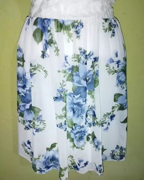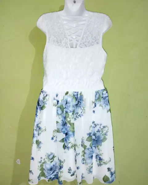 Lindo vestido corto, la parte de arriba es de encaje y la falda es una tela delgada floreada.Color: Blanco con flores azulesTalla: 7
