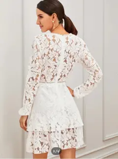 Vestido de encaje blanco, corto a la rodilla más o menos, manga larga, la espalda se transparenta un poco y la tela tiene un poco de lycra.