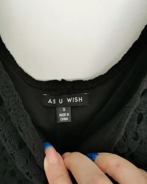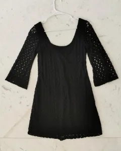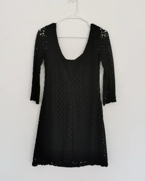 Vestido de encaje As U Wish. Vestido de tela tipo encaje. Corte línea A. Tiene bajo vestido. Color negro. Cuello redondo muy amplio. Mangas 3/4 acampanadas. Talla S.