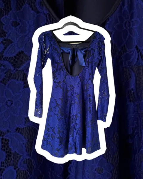 Vestido de encaje azul, con hermoso escote en espalda, lo más bonito es el moño de l espalda, manga larga y falda circular