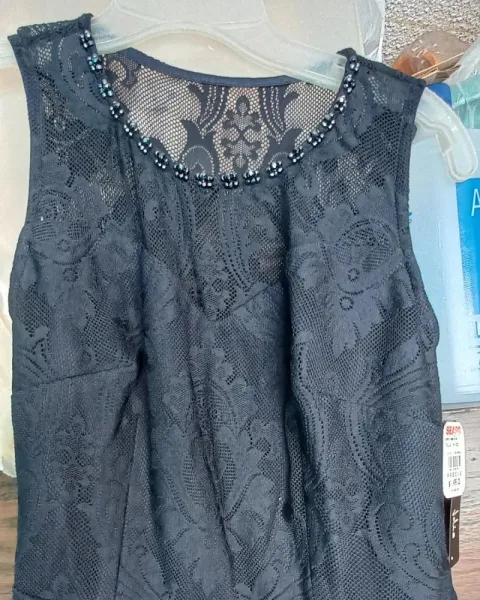 vestido largo, azul marino de encaje, con piedritas en el cuello, cierre en un costado, nuevo con etiqueta.