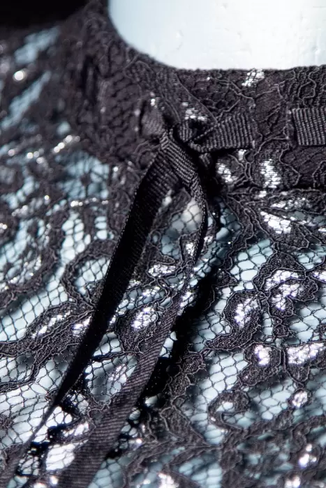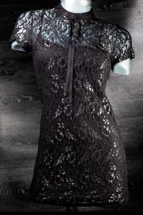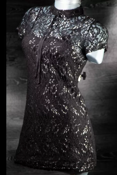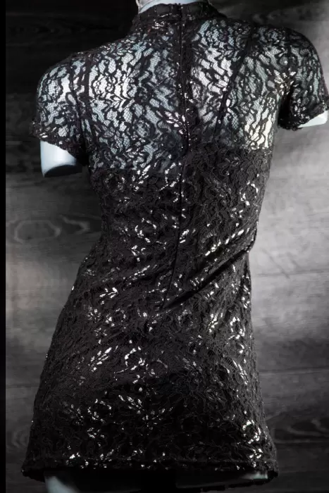 Vestido de encaje color negro. Coqueto vestido corto con fondo y encaje superior con destellos en plata y cuello alto. Es talla L, pero viene reducido y considero es mejor para una talla CH o M. Mide 41 cm de axila a axila con strech hasta los 46 cm y tiene 80 cm de largo. Queda arriba de la rodilla y da una silueta muy bonita.