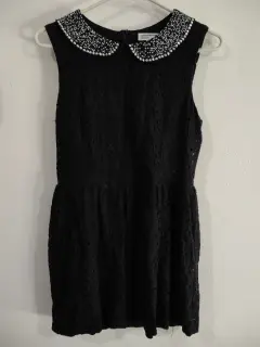Vestido negro de encaje con forro, tiene detalle en el cuerllo decorado con Brillos plateados y negros.Es perfecto para cualquier ocasiòn y deslumbrar con tu belleza el mundo.Las tallas son juveniles de USA por favor verifica las medidas o si tienes duda preguntanos y te apoyamos