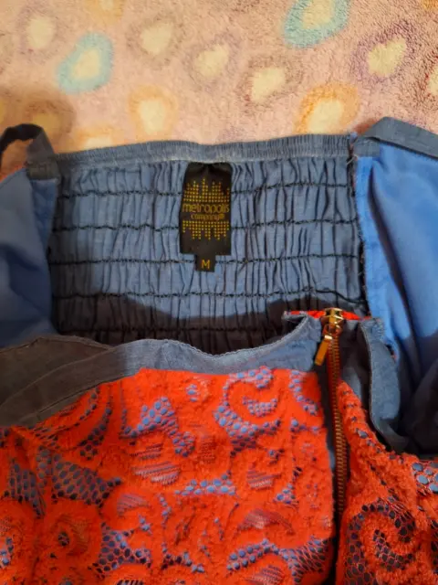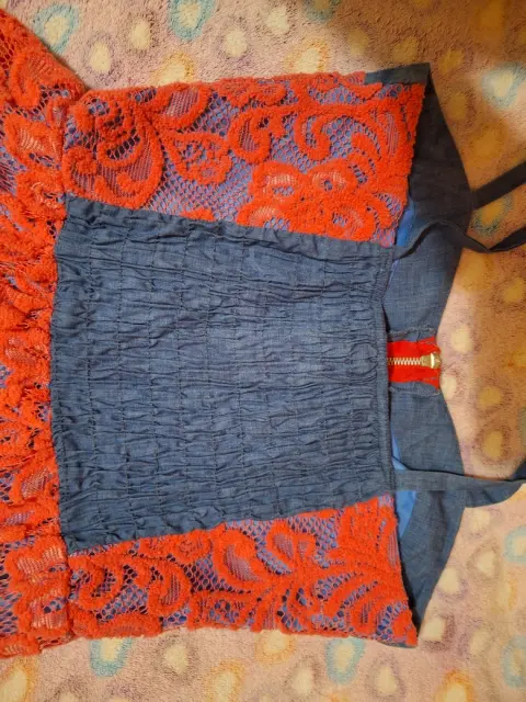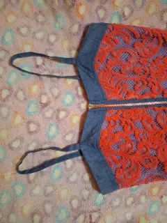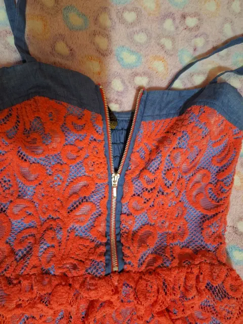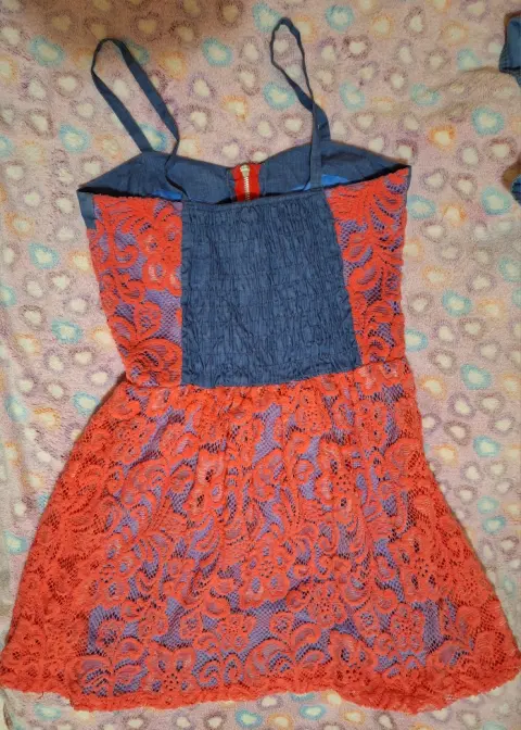 Hermoso, fresco y coqueto vestido de tirantes, es de mezclilla delgada y encaje de color rosa. Tiene un fondo de color azul. Enfrente, en el busto tiene cierre que funciona correctamente. En la parte de atrás tiene resorte que ajusta bien a tu figura.
