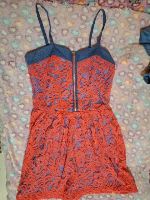 Vestido de encaje coqueto. Hermoso, fresco y coqueto vestido de tirantes, es de mezclilla delgada y encaje de color rosa. Tiene un fondo de color azul. Enfrente, en el busto tiene cierre que funciona correctamente. En la parte de atrás tiene resorte que ajusta bien a tu figura.
