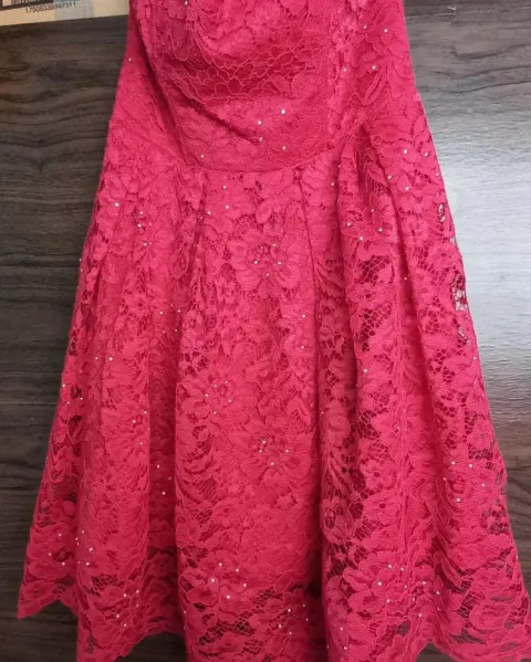 Vestido de encaje fiusha. Vestido color fiusha de encaje con brillos, sin tirantes tipo strapless solo se uso una vez, con cierre en la espalda