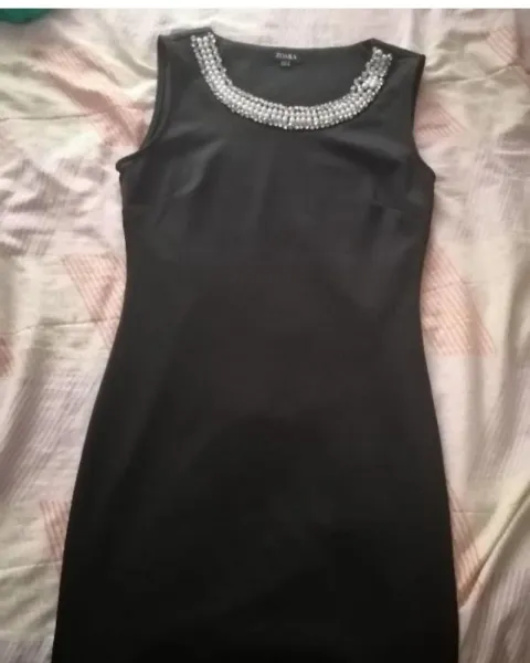 Lindo vestido de fiesta color negro, con bonitos detalles en el cuello de color plateado, talla mediano llega un poco arriba a de la rodilla.