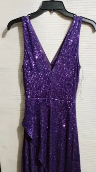 Vestido de fiesta. Vestido de lentejuelas, manga sisa , escote v. Asimétrico. Es pegadito de el talle y con cauda en caderas .