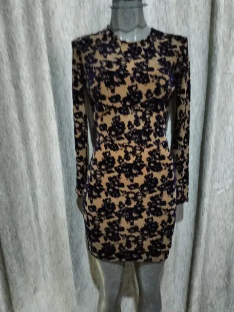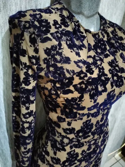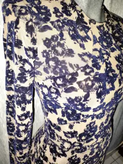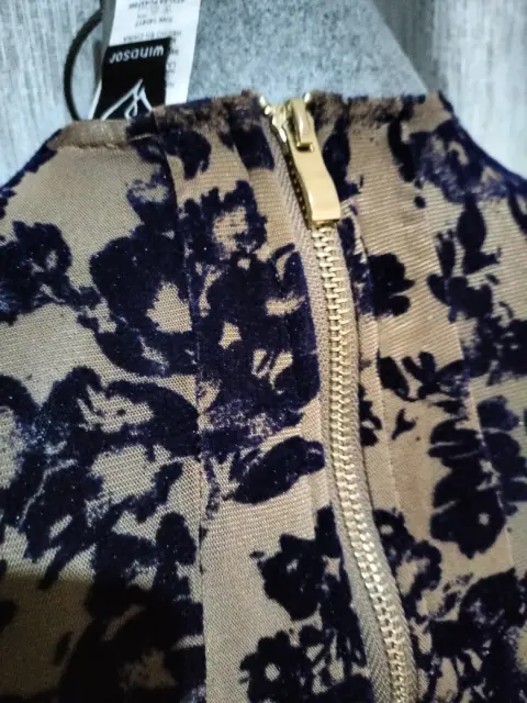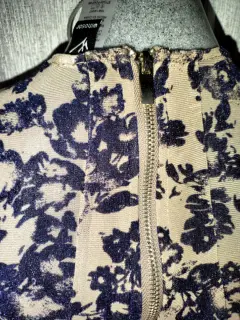 Vestido corto , elegante color beige con tela bordada de flores color azul rey , cierre color dorado , muy bonito