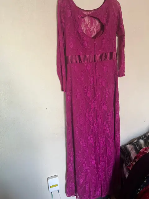 VESTIDO DE FIESTALARGO, DE ENCAJE CON FORRO DE LICRA, LIGERO, COLOR FUCSIA, DETALLE DE LISTÓN Y MOÑO AL FRENTE