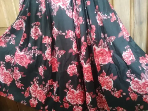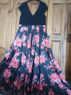 Negro con rosas rojas, falda amplia con una abertura a un lado, cuello y espalda en v, cierre en la parte de atrás, largo acomoda muy bien