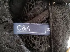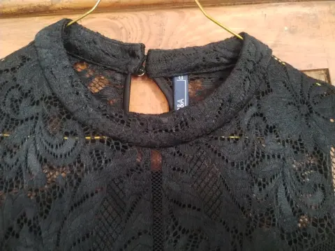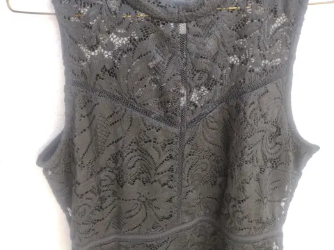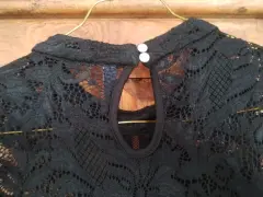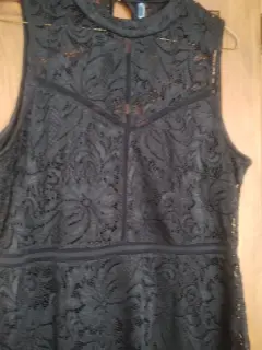 Negro de encaje, corto, cuello redondo sin mangas, tiene dos botones para abrocharse acomoda muy bien