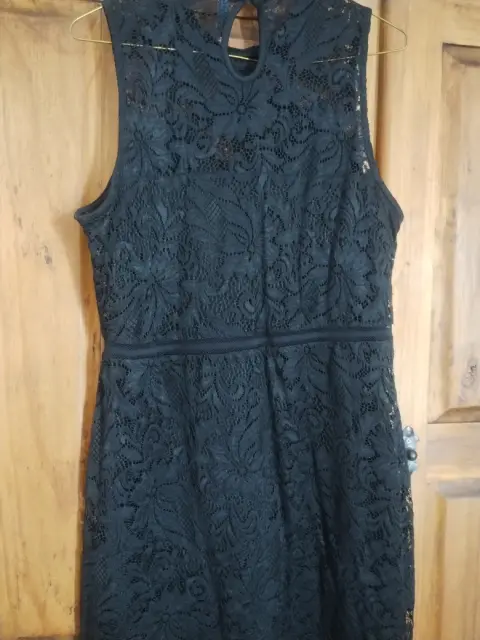 Vestido de fiesta. Negro de encaje, corto, cuello redondo sin mangas, tiene dos botones para abrocharse acomoda muy bien